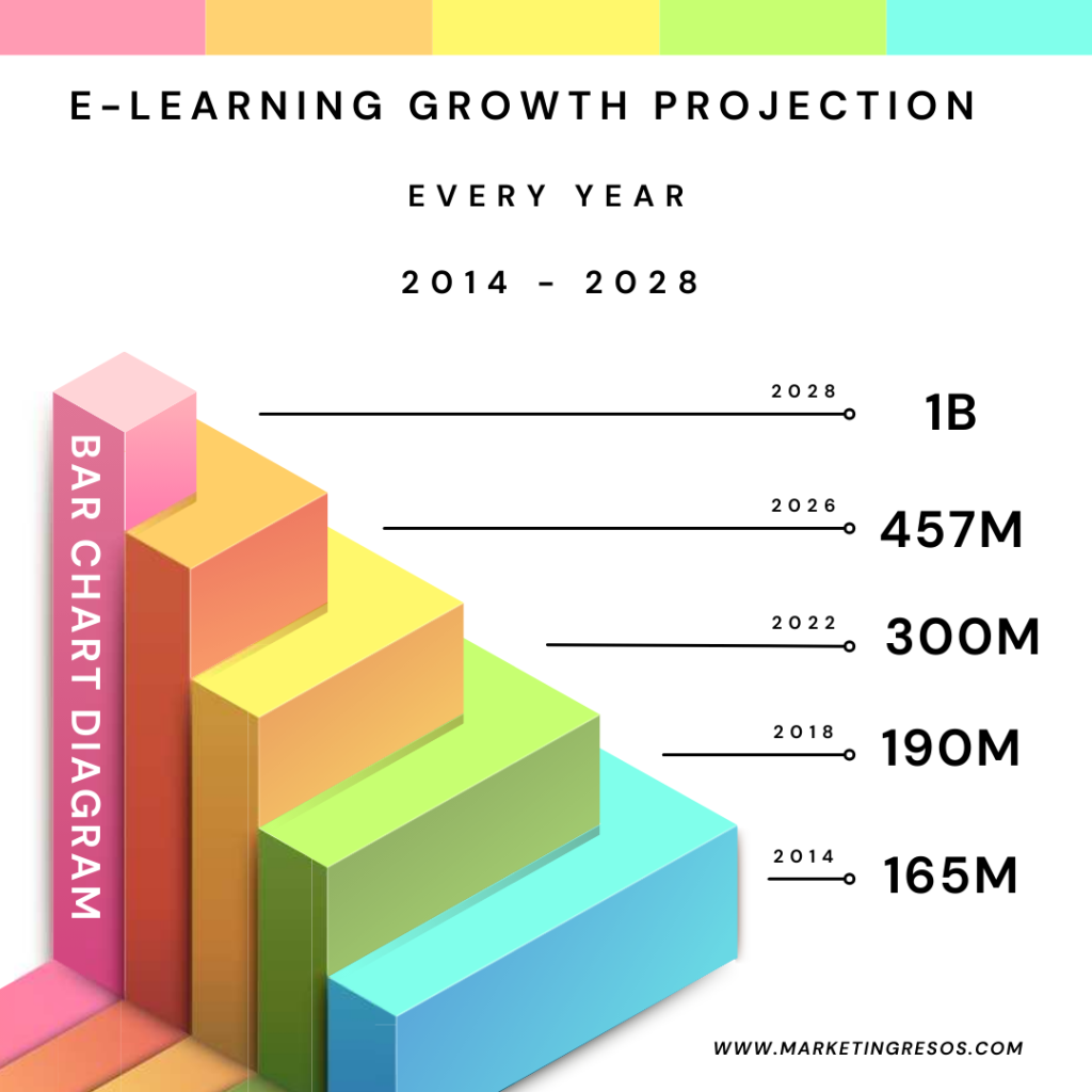 El mercado mundial del e-learning tendrá un valor de 325.000 millones de dólares en 2025. En 2014, era de 165.000 millones, ¡el crecimiento se ha duplicado en una década! Y no solo eso: para 2028, el mercado mundial de este sector crecerá hasta 1 billón de dólares*. ¿Vas a aprovechar ya las ventajas de la Era Digital en la educación, como están haciendo millones de personas, o vas a quedarte atrás? |
