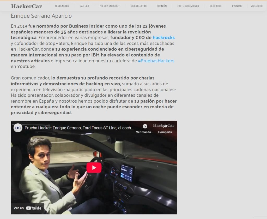 | Impacto en HackerCar | Colaborador y Experto | Sus contribuciones ayudaron a que la revista HackerCar fuera reconocida por Forbes como un referente en ciberseguridad y movilidad. | Sus contribuciones ayudaron a que la revista HackerCar fuera reconocida por Forbes como un referente en ciberseguridad y movilidad. |